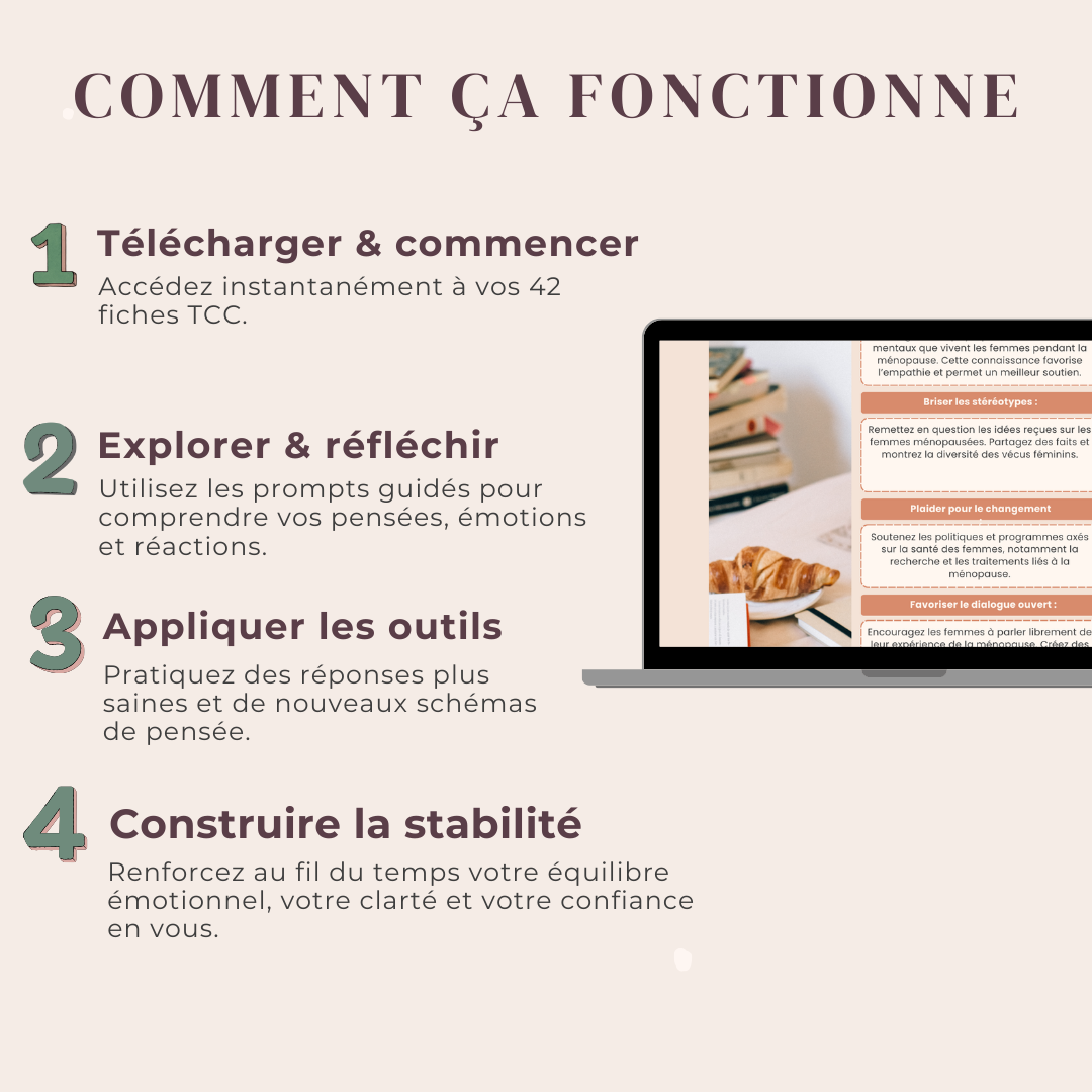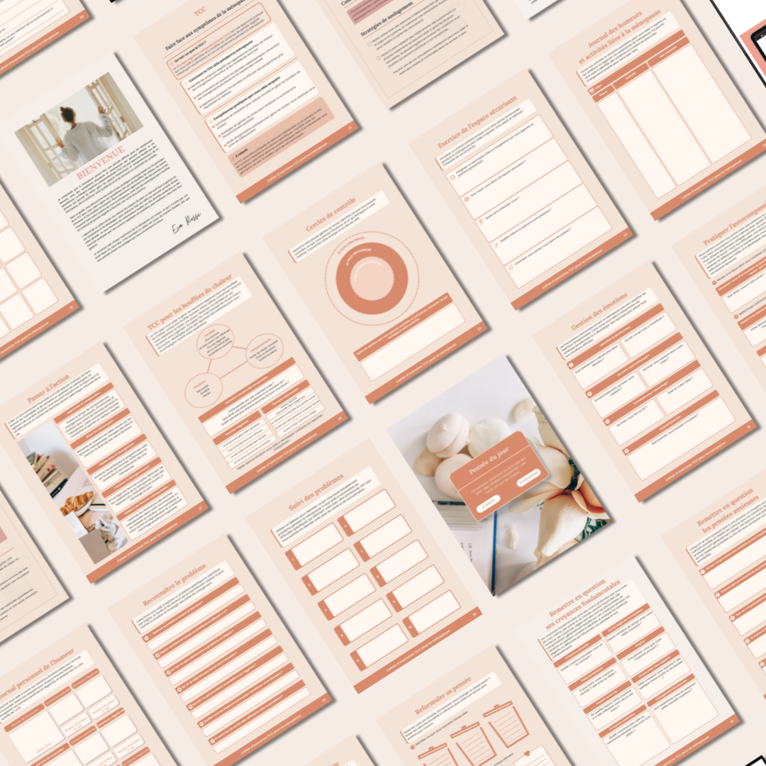 Il ne s’agit pas d’un simple pack générique de fiches de santé mentale. C’est un cahier guidé de 42 pages, conçu pour aider les femmes à comprendre le lien entre leurs pensées, leurs émotions et leurs comportements pendant la ménopause, tout en leur offrant des outils structurés pour remettre en question les pensées négatives et développer des réponses plus saines.