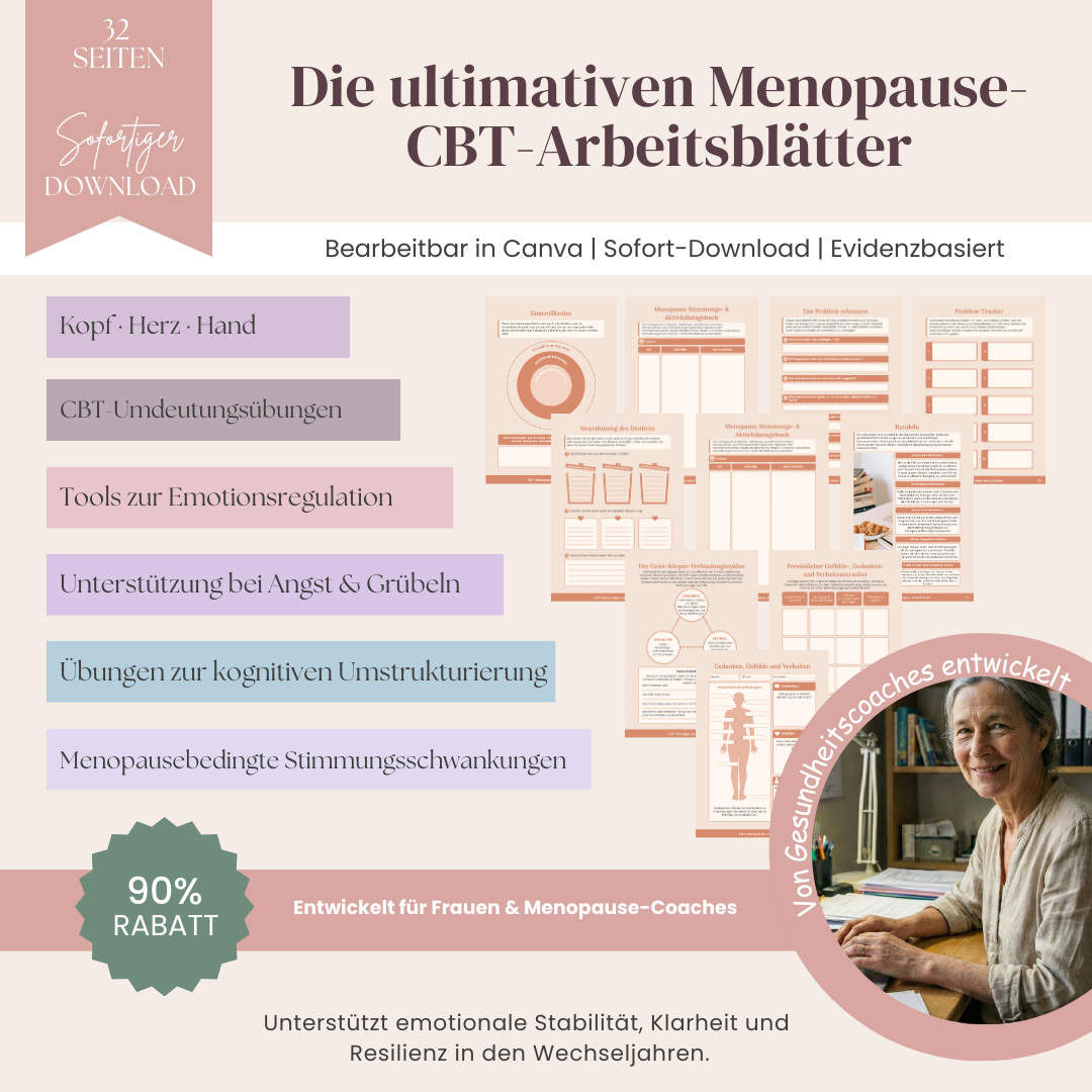 Die ultimativen Menopause-CBT-Arbeitsblätter wurden entwickelt, um Frauen in dieser Lebensphase mit wissenschaftlich fundierten, speziell auf die Menopause abgestimmten Methoden der kognitiven Verhaltenstherapie (CBT) zu unterstützen.