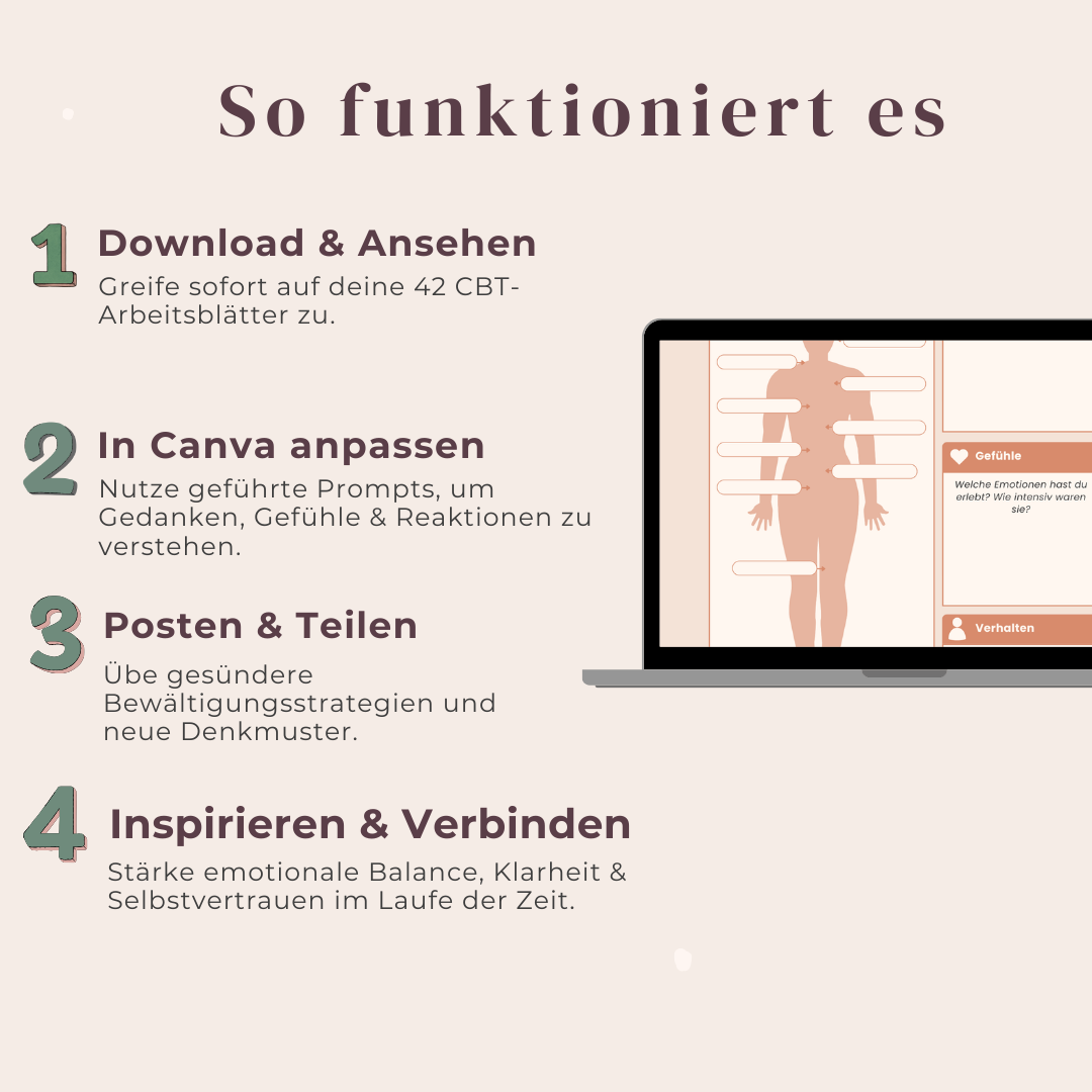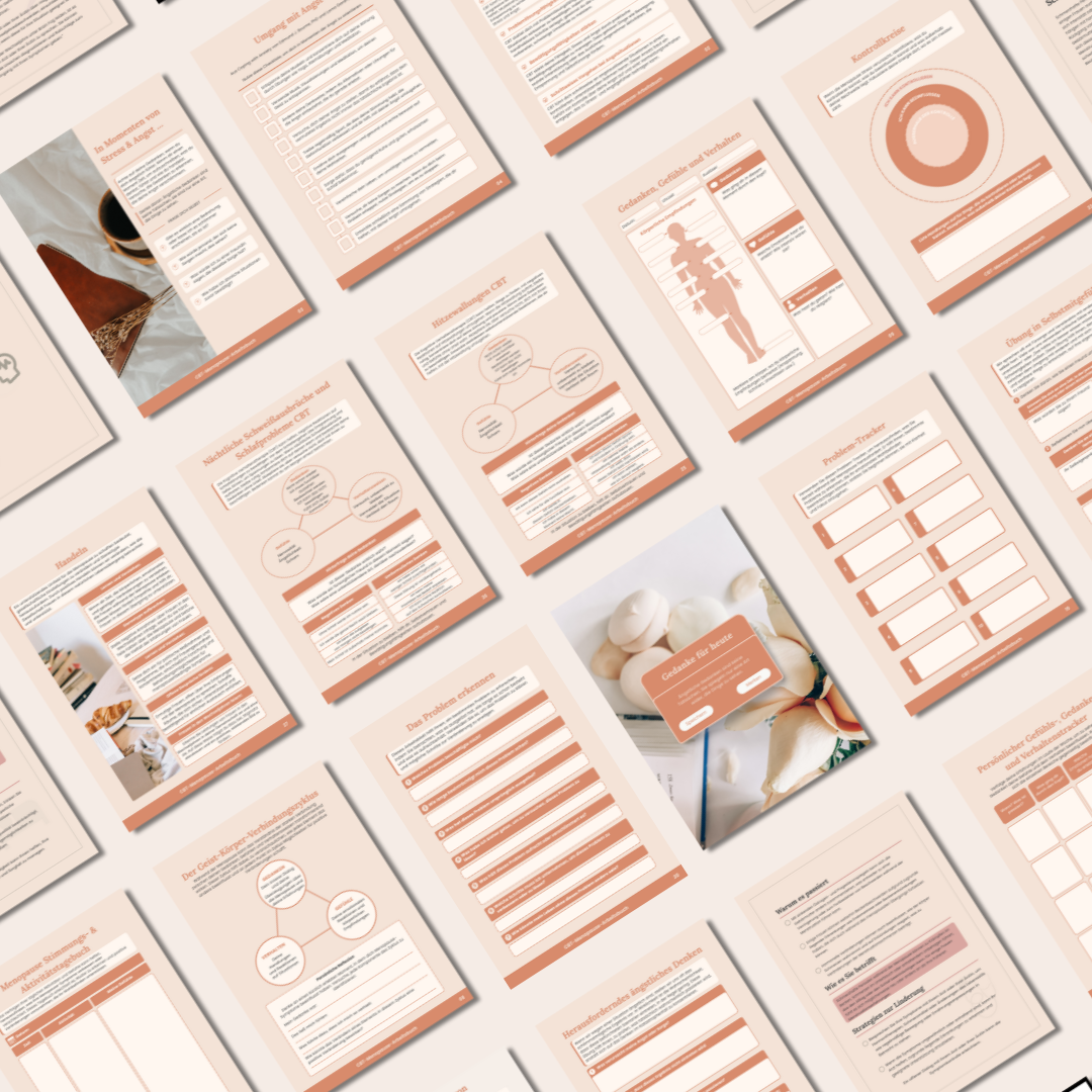 Im Inneren werden Frauen sanft durch CBT-basierte Methoden geführt, um Ängste, Brain Fog, Schlafstörungen, emotionale Belastung, Selbstzweifel und Überforderung zu bewältigen — mithilfe klarer Arbeitsblätter, die zu Bewusstsein, Reflexion und echter Veränderung anregen.