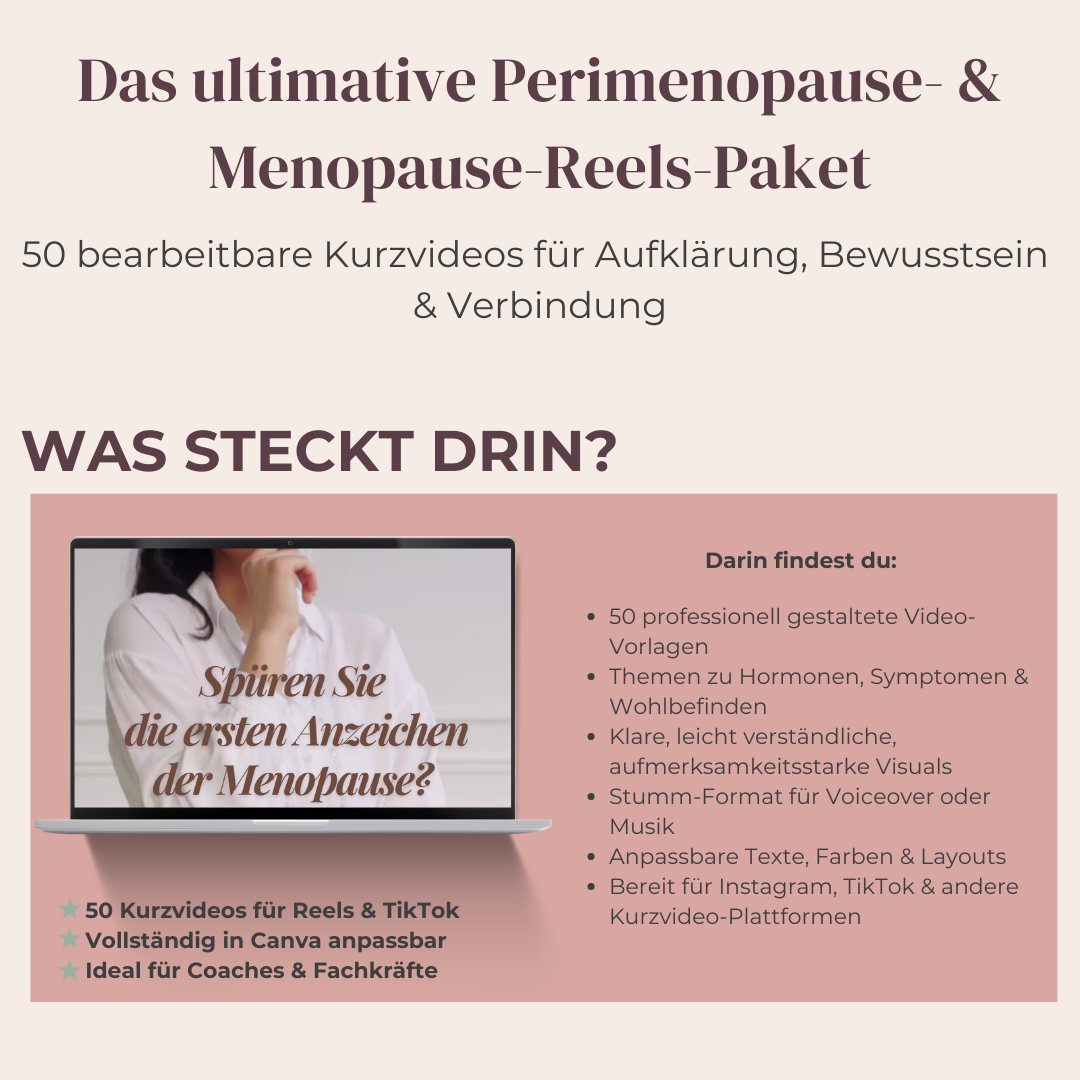 Dies sind keine generischen Social-Media-Videos. Jedes Reel wurde gezielt so entwickelt, dass es Frauen anspricht, die hormonelle Veränderungen erleben — mit Themen wie hormonelles Gleichgewicht, Symptomverständnis, emotionale Unterstützung und Selbstfürsorge während der Menopause.