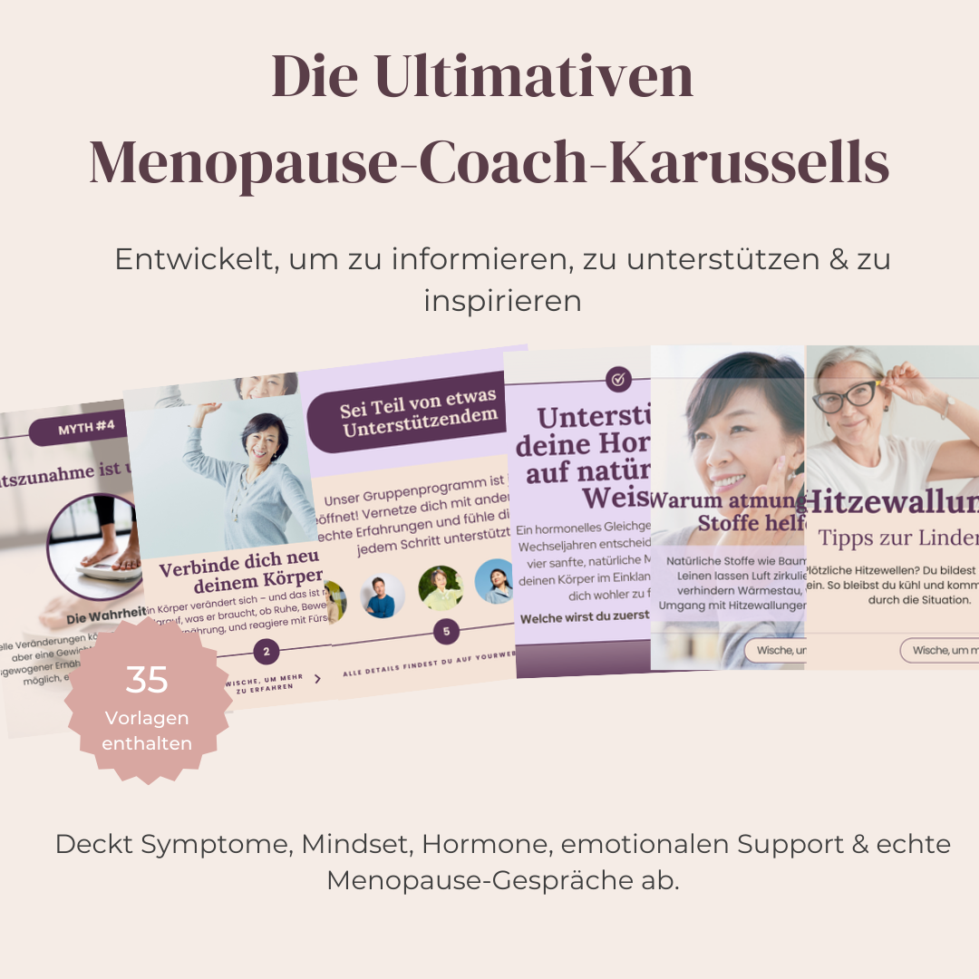 Diese Sammlung aus 35 Karussells bietet dir wunderschön gestaltete, sofort einsetzbare Inhalte, mit denen du Frauen in der Perimenopause und Menopause aufklären, stärken und unterstützen kannst — mit fundierten Informationen, einfühlsamer Sprache und echter Lebensnähe.