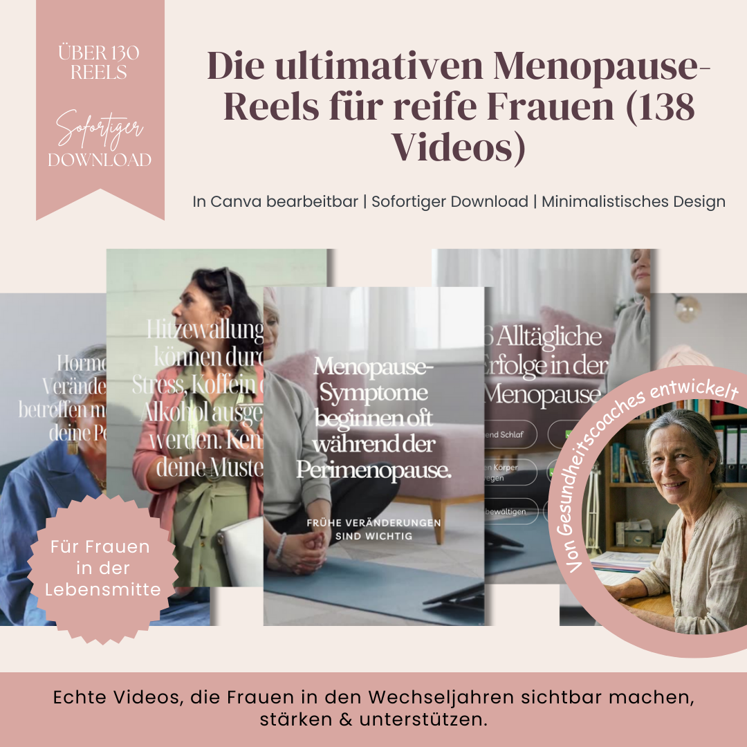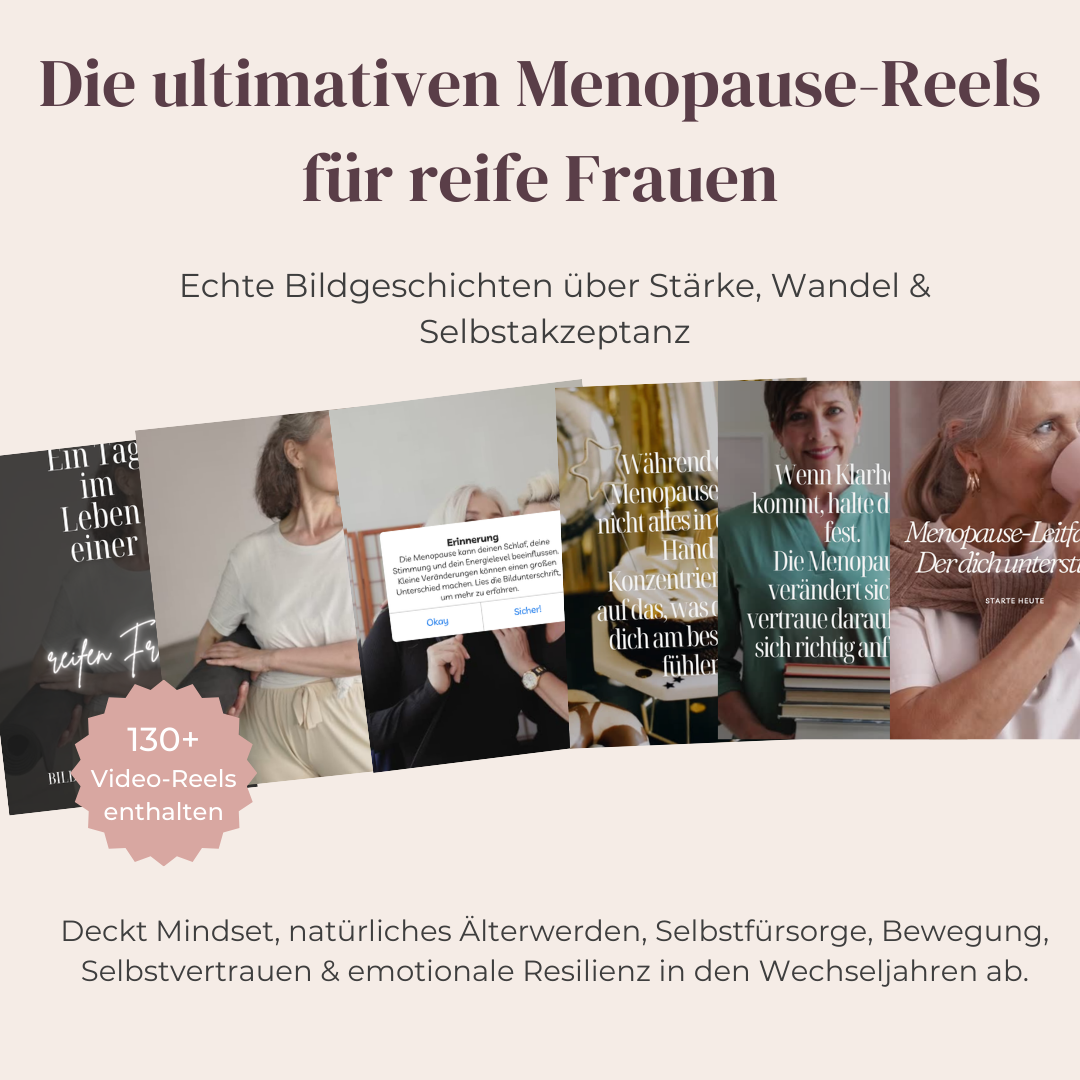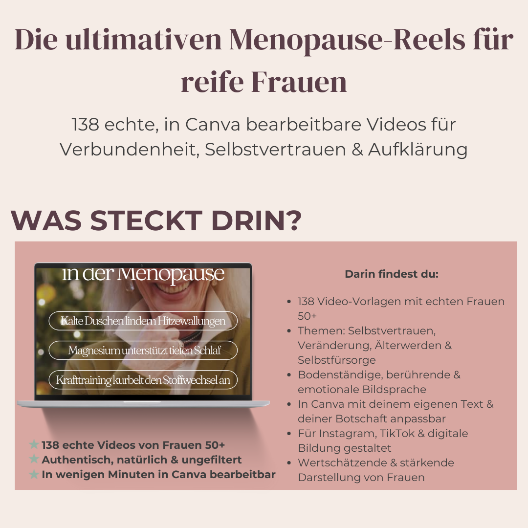 Die ultimativen Menopause-Reels für reife Frauen bestehen aus 138 kurzen, authentischen Video-Vorlagen aus dem echten Leben, die Frauen über 50 zeigen, wie sie die Menopause mit Würde, Mut, Selbstwahrnehmung und Resilienz durchleben.