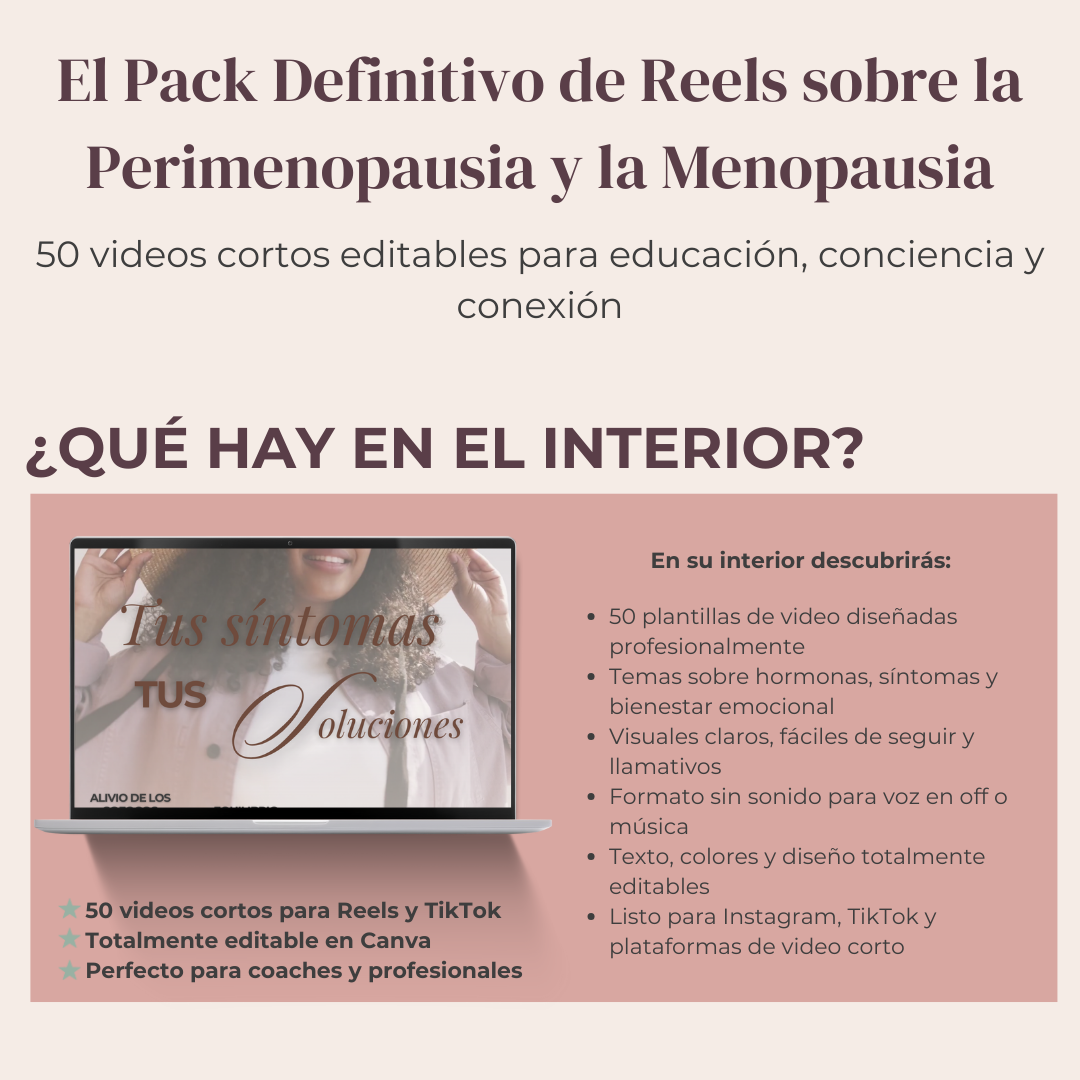 Durante la perimenopausia y la menopausia, las mujeres buscan activamente respuestas, claridad y guía — y el video en formato corto se ha convertido en la forma más poderosa de llegar a ellas. Esta colección de 50 reels profesionales y editables te permite educar, apoyar y conectar con tu audiencia de una manera moderna y atractiva.