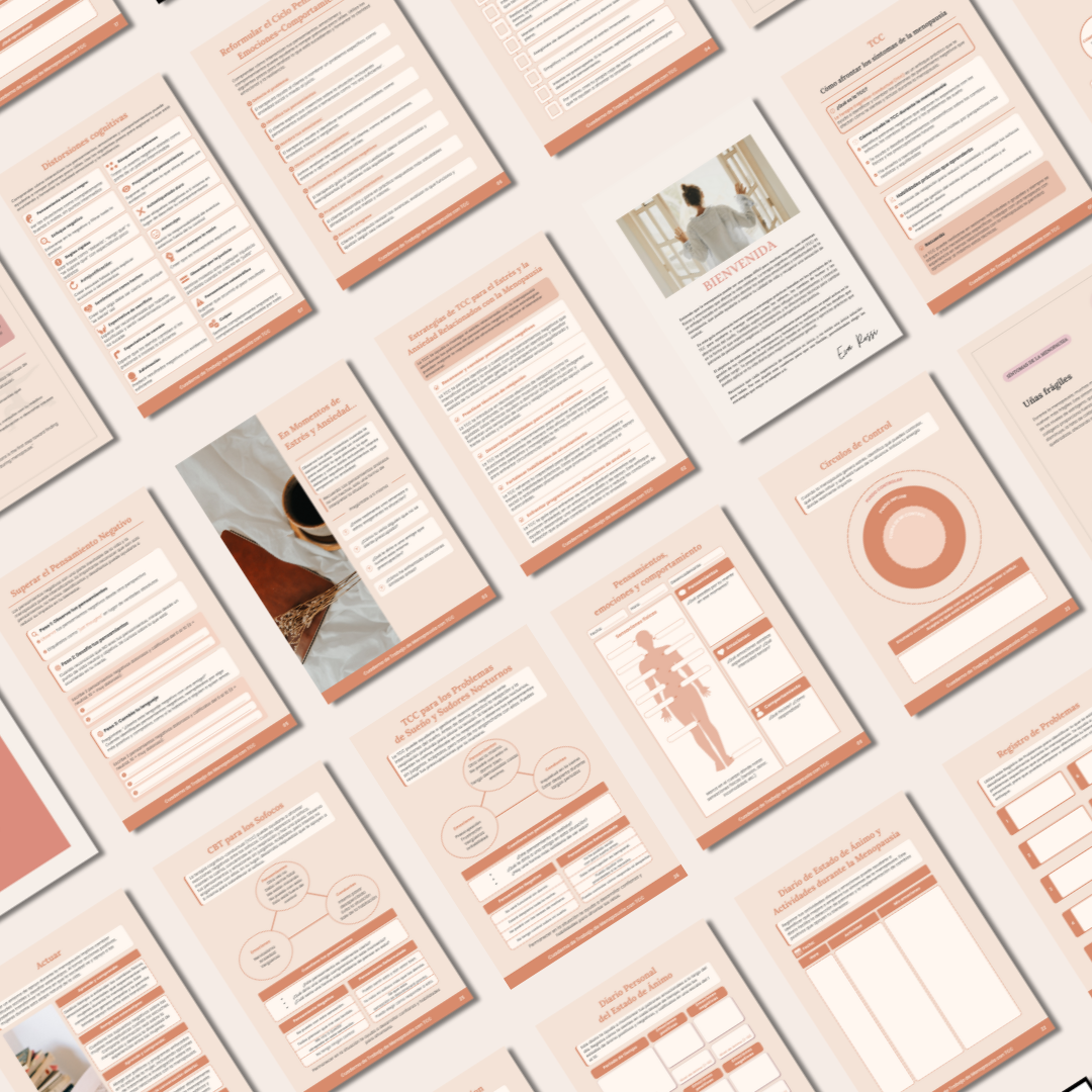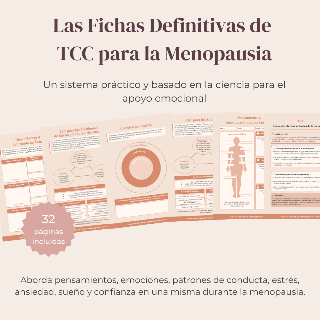 Este no es un paquete genérico de fichas de salud mental. Es un cuaderno guiado de 32 páginas enfocado en ayudar a las mujeres a comprender la conexión entre sus pensamientos, emociones y comportamientos durante la menopausia, ofreciendo herramientas estructuradas para desafiar pensamientos negativos y desarrollar respuestas de afrontamiento más saludables.