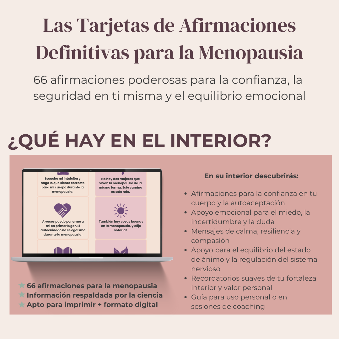 Las Tarjetas de Afirmaciones Definitivas para la Menopausia incluyen 66 afirmaciones cuidadosamente redactadas, específicas para esta etapa, diseñadas para apoyar a las mujeres a lo largo de los altos y bajos emocionales de la transición. Cada afirmación está creada para reconectarte con la sabiduría de tu cuerpo, calmar tu sistema nervioso y recordarte que sigues siendo completa, poderosa y profundamente valiosa.