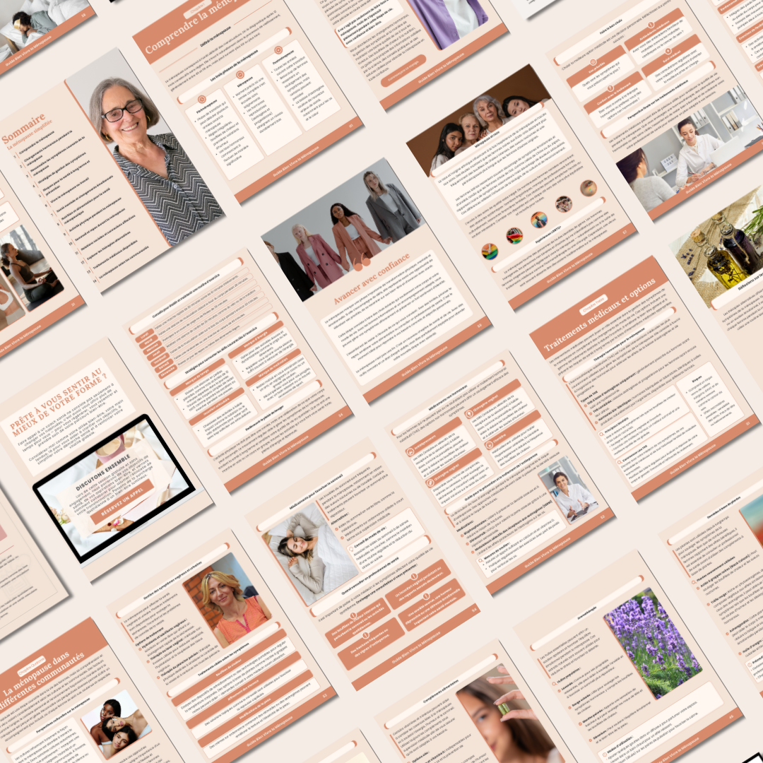À l’intérieur, vous explorez la réalité de la ménopause — des changements hormonaux à la reconnaissance des symptômes, en passant par le mindset, le self-care, les limites personnelles, le sommeil, la gestion du stress, la nutrition et la résilience émotionnelle.