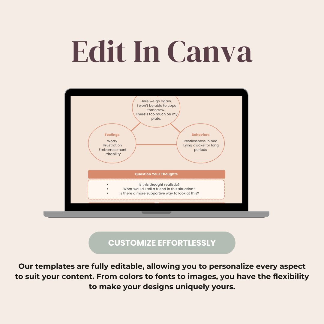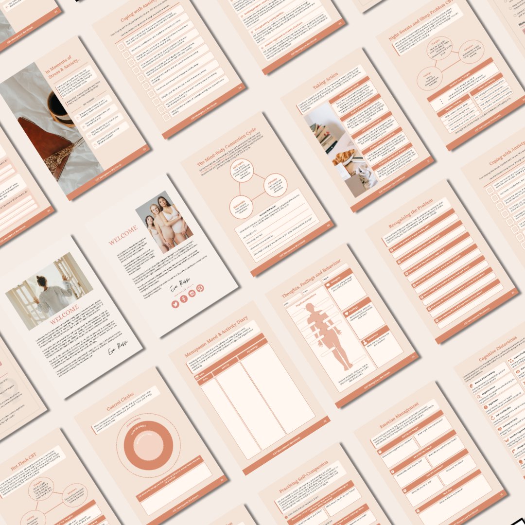 This is not a generic mental health worksheet pack. It is a 32-page guided workbook focused on helping women understand the connection between their thoughts, emotions, and behaviours during menopause, and providing structured tools to challenge negative thinking and develop healthier coping responses.