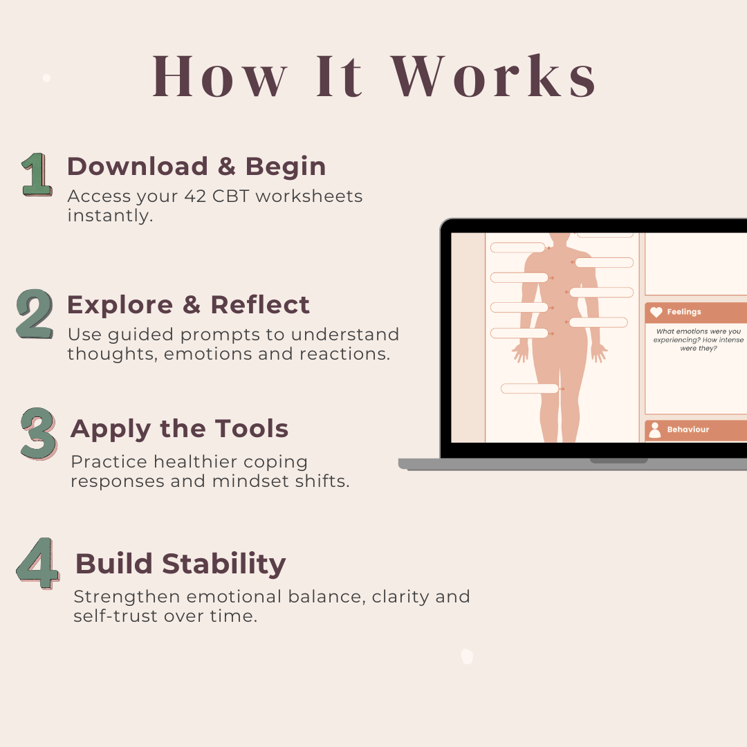 Inside, women are gently guided through CBT-based practices to support anxiety, brain fog, sleep disruption, emotional distress, self-doubt, and overwhelm — with clear worksheets that encourage awareness, reflection, and meaningful change.