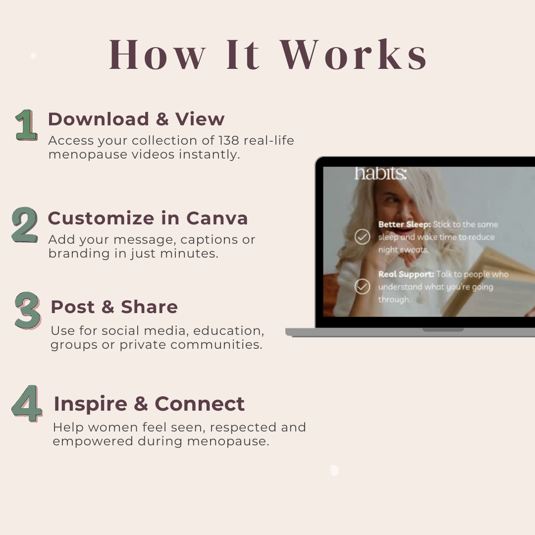 The Ultimate Menopause Mature Women Reels is a set of 138 short, authentic, real-life video templates designed to represent women over 50 navigating menopause with grace, courage, self-awareness, and resilience.