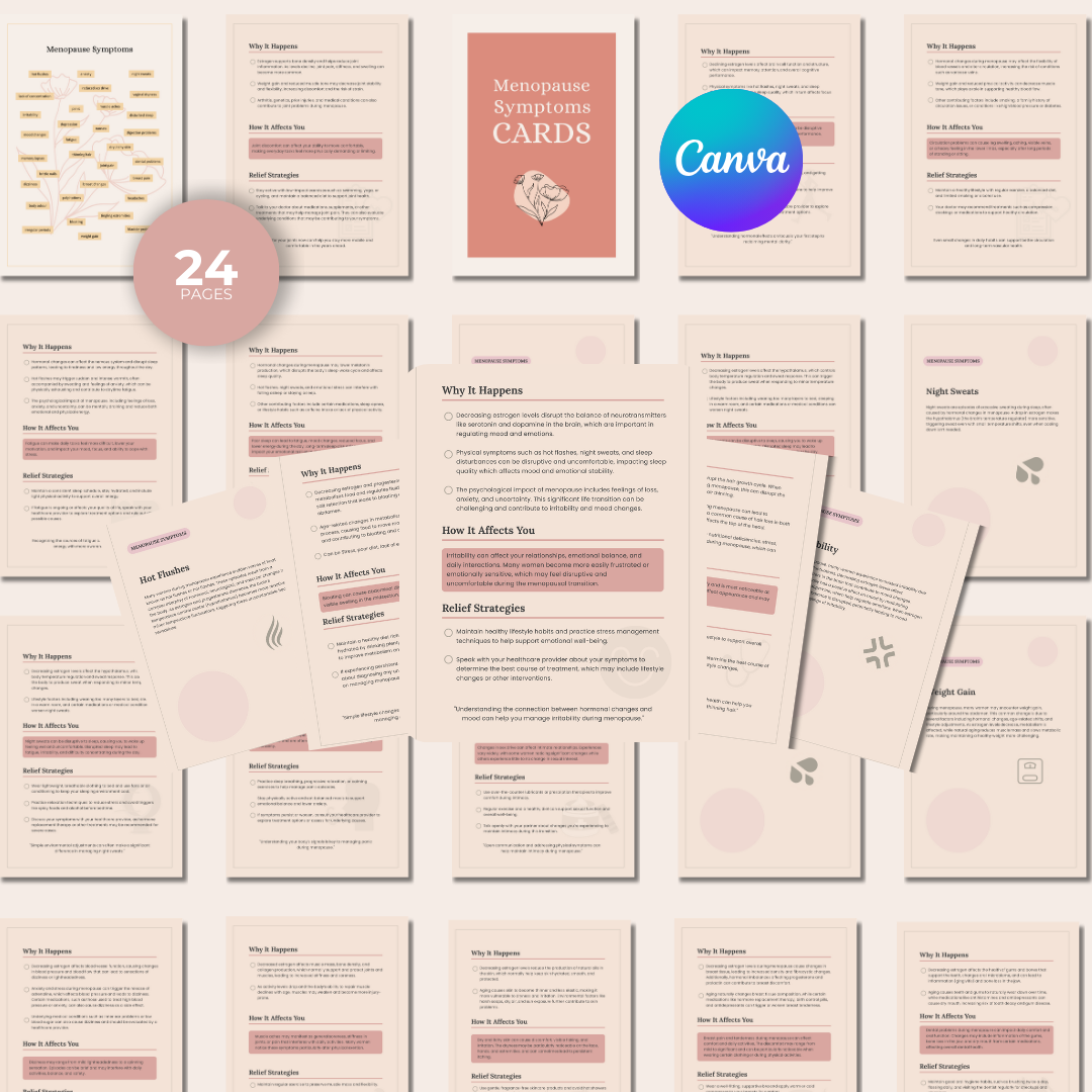 Menopause is not just a phase — it is a complex biological transition that affects nearly every system in a woman’s body. Yet for many women, the experience is confusing, isolating, and misunderstood. These 41 pages of symptom cards were created to bring clarity, understanding, and empowerment to one of the most significant chapters of a woman’s life.