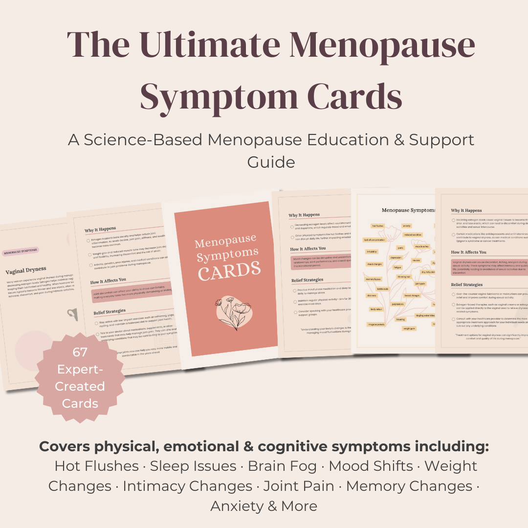 This isn’t a simple list of symptoms. The Ultimate Menopause Symptom Cards is a carefully researched, science-based guide that breaks down the most common (and often overlooked) physical, cognitive, and emotional changes that occur during perimenopause and menopause, including hot flushes, sleep disruption, brain fog, mood changes, weight gain, intimacy challenges, and more.