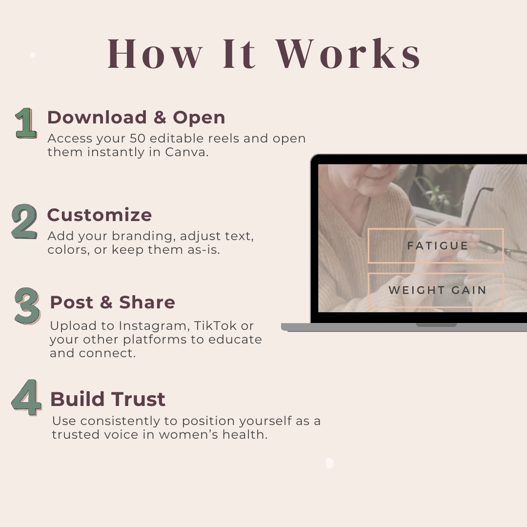 During perimenopause and menopause, women are actively searching for answers, clarity, and guidance — and short-form video has become the most powerful way to reach them. This collection of 50 professionally-designed, editable reels allows you to educate, support, and connect with your audience in a modern, engaging way.